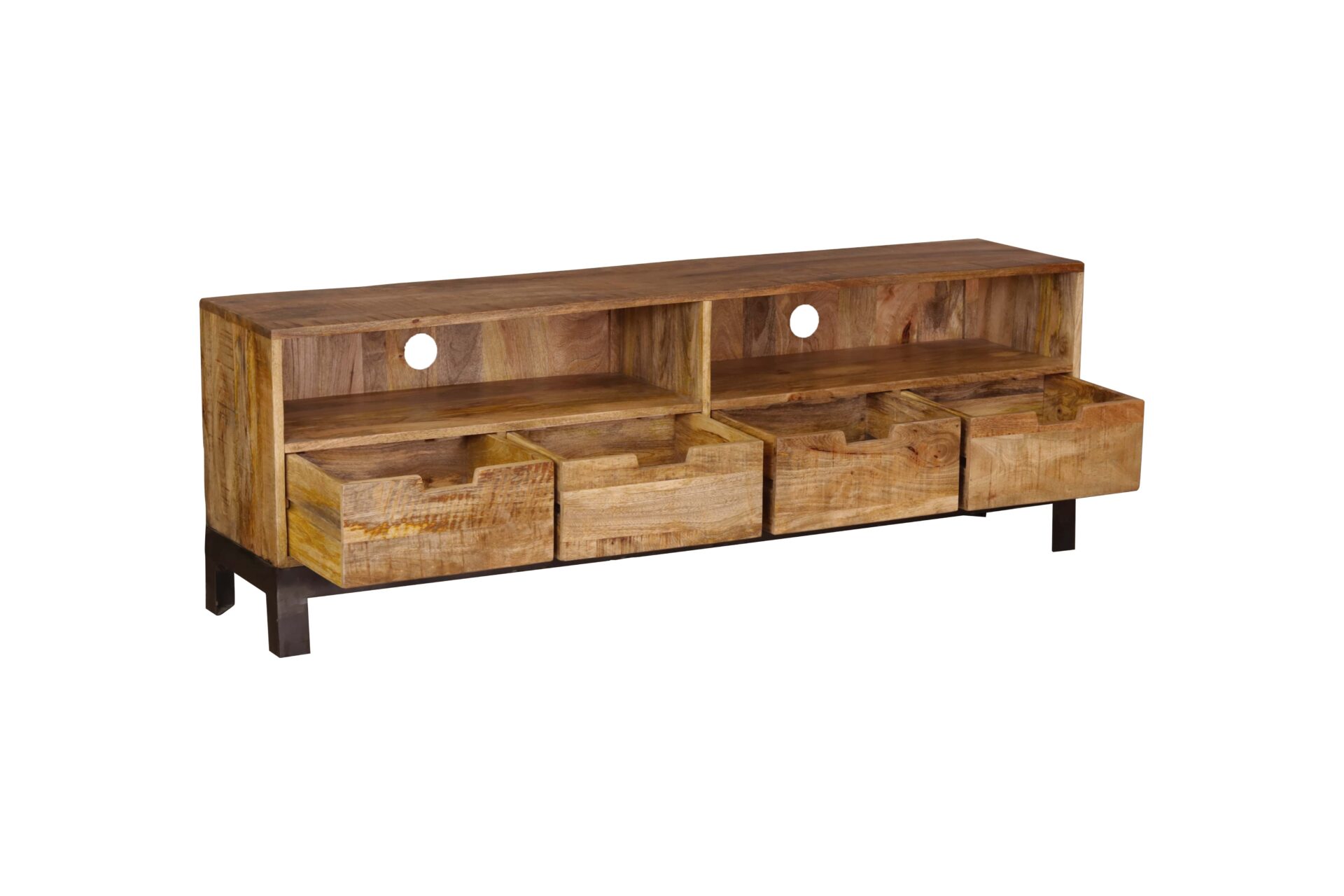 Le meuble TV de la collection sample allie parfaitement style et praticité pour créer une pièce fonctionnelle au design exceptionnel. Fabriqué en bois de manguier de première qualité, ce meuble incarne la chaleur naturelle du bois tout en apportant une touche contemporaine à votre espace de divertissement. Les pieds en métal ajoutent une dimension industrielle moderne, assurant une stabilité robuste tout en créant un contraste visuel saisissant avec le bois chaleureux. Cette combinaison de matériaux crée un équilibre harmonieux entre l’élégance intemporelle et la modernité audacieuse. Avec ses 4 tiroirs spacieux, le meuble offre un espace de rangement organisé pour vos objets multimédias, télécommandes et autres accessoires. De plus, les 2 niches ouvertes sont parfaites pour accueillir vos équipements audiovisuels, consoles de jeux ou décorations élégantes. Les lignes épurées et la disposition astucieuse des compartiments confèrent à ce meuble TV une esthétique équilibrée, idéale pour compléter divers styles de décoration intérieure. Que votre ambiance soit contemporaine, industrielle ou même rustique, ce meuble apporte une polyvalence sans compromis sur le style. Avec le meuble TV en manguier et pieds en métal, vous ne faites pas seulement l’acquisition d’un meuble fonctionnel, mais également d’une pièce maîtresse qui revalorisera l’aspect visuel de votre espace de divertissement avec élégance et sophistication.