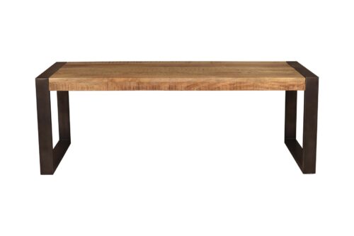 Le plateau rectangulaire, mesurant 220 cm de long, offre une surface généreuse pour accueillir vos repas, vos réunions familiales ou vos moments de détente. Fabriqué en manguier massif, le plateau présente un grain de bois distinctif, de légères ondulations et traits de scies apportant une touche de chaleur naturelle et artisanale à l’ensemble.